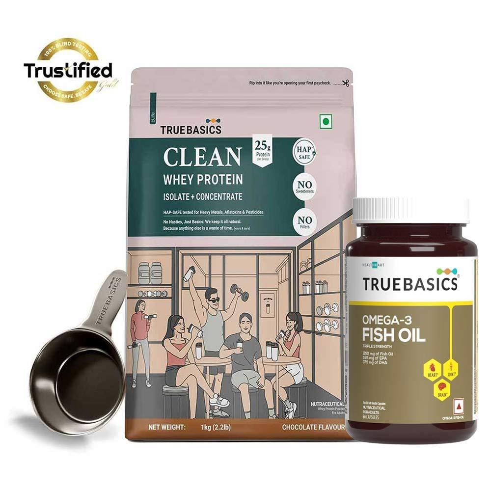 Product Details of Clean Whey Protein Isolate + Concentrate 1kg Chocolate & Fish Oil 60 Caps Combo