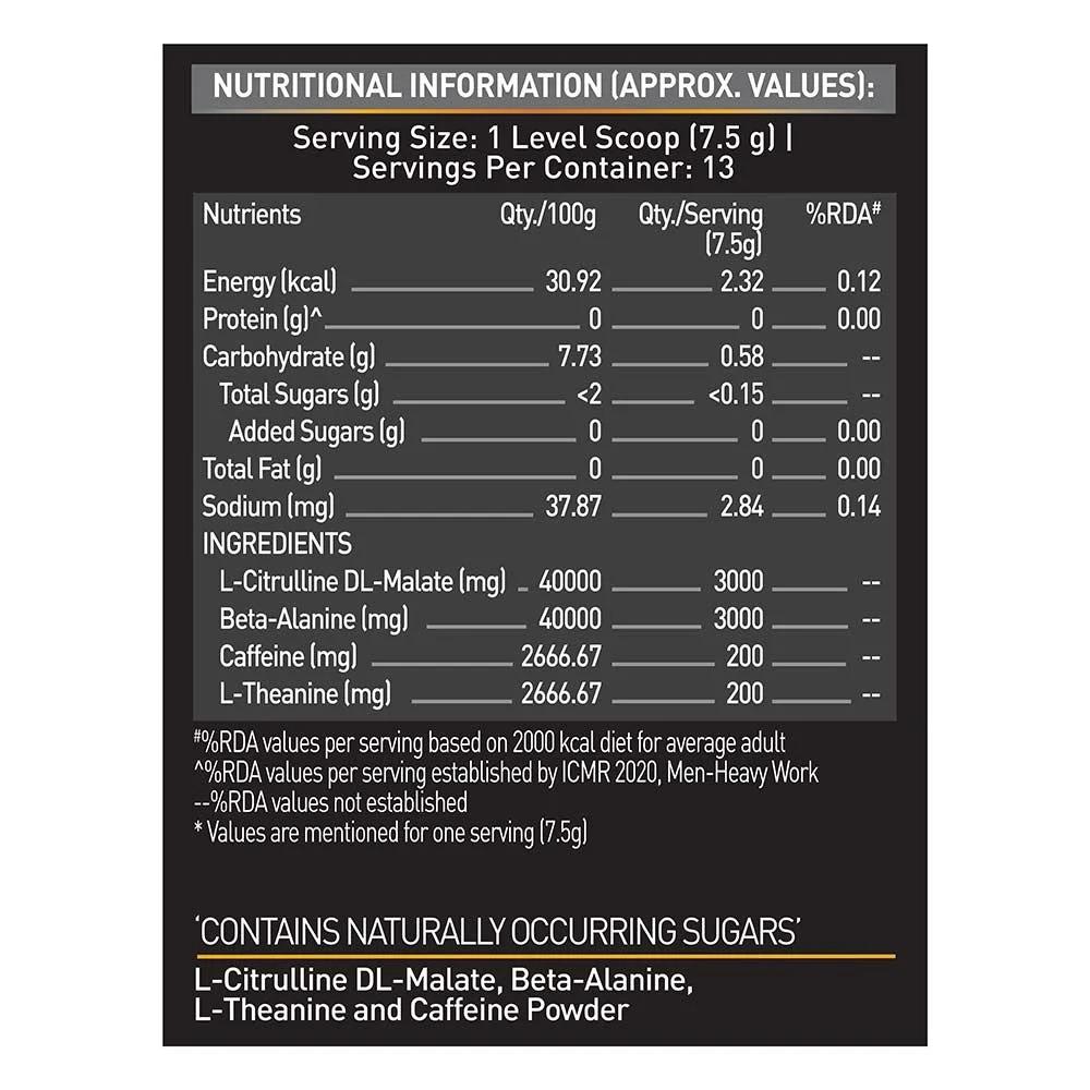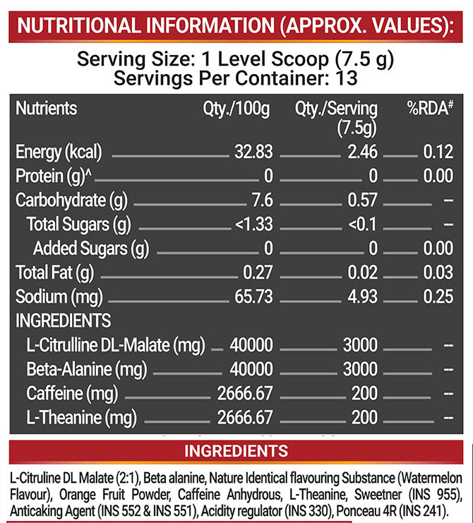 Beta Alanine 3000 mg The “tingle” ingredient; buffers lactic acid to delay muscle fatigue.