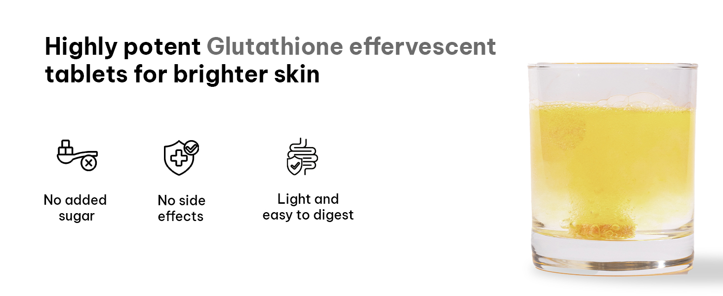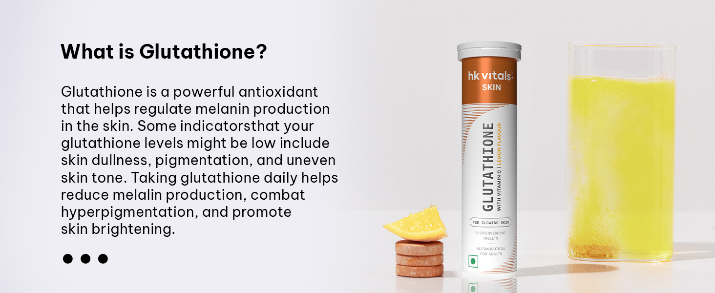 Introducing HK Vitals Glutathione Effervescent, a powerful blend of 600mg L-Glutathione, Hyaluronic Acid and Vitamin C & E. One tablet daily will improve your skin glow and help reduce pigmentation.