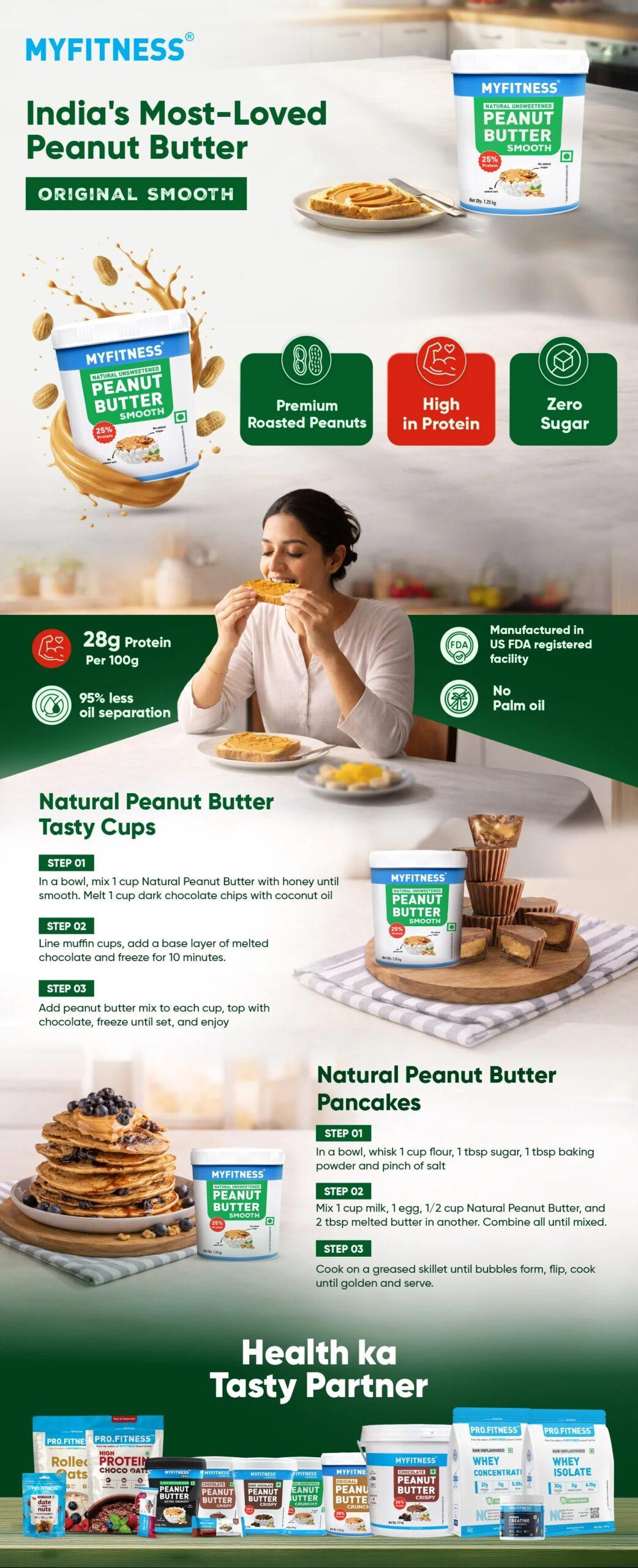 It is not necessary to consume a specific amount of Myfitness natural peanut butter. Nonetheless, incorporating Myfitness Natural Crunchy Peanut Butter into your diet will help you deliciously fulfil your daily nutritional requirements. Here are some diet tips to think about if you’re going to use the product: