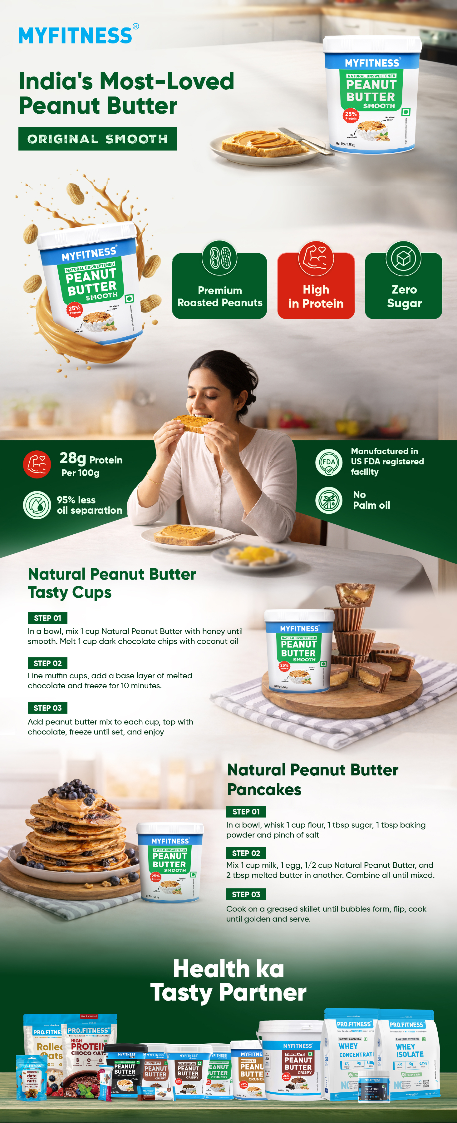 Myfitness natural peanut butter features no trans-fat and no cholesterol, making it a healthier alternative to other chocolate and hazelnut spreads created by foreign firms. Myfitness peanut butter is sugar-free, making it safe for people suffering from obesity and diabetes. Turmeric apple cider vinegar, avocado butter, lemon, matcha apple cider vinegar, all-natural chocolate almond butter and cinnamon peanut butter are all in the works at Tanvi Fitness.