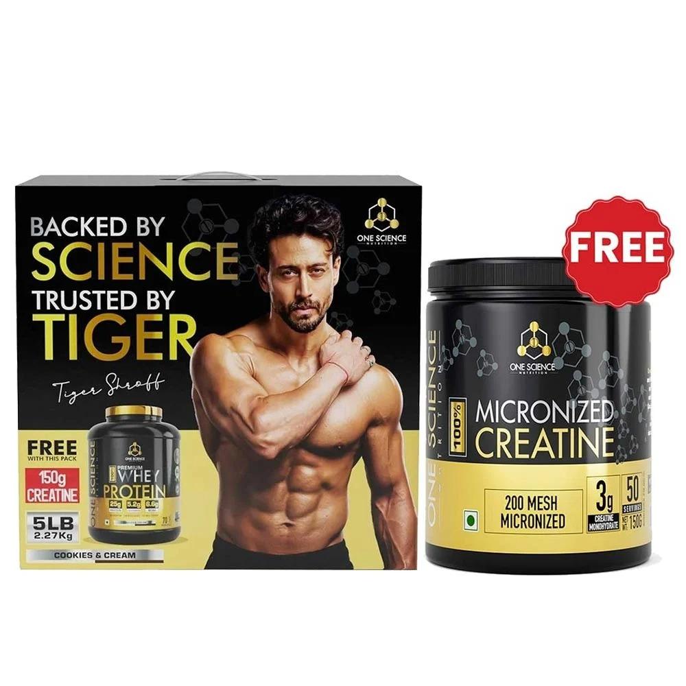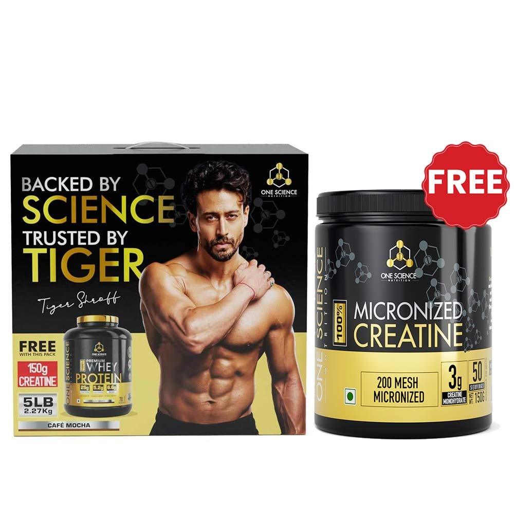 Power your workouts with the One Science Nutrition 100% Premium Whey Protein – Tiger Pack, specially designed for serious athletes and fitness enthusiasts. This powerful 5 LBS Combo Pack comes in a rich Chocolate Charge flavour along with Free 150g Creatine, making it the perfect all-in-one solution for muscle gain, strength, and faster recoveryEach scoop delivers high-quality whey protein that helps build lean muscle mass, repair tissues, and improve overall performance. Fortified with essential amino acids, this formula supports quick absorption and enhanced muscle recovery after intense training sessionsThe added 150g Creatine Monohydrate boosts your strength, endurance, and workout intensity, helping you train harder and achieve better results in less time. Ideal for bodybuilders, gym-goers, and anyone focused on fitness transformation.