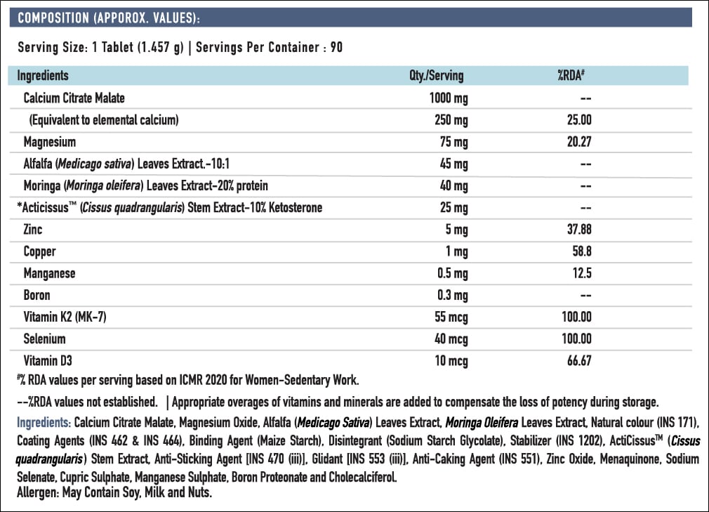 • Goodness of Herbal extracts like Moringa, ActiCissus & Alfalfa help in bone mineralization & strengthening