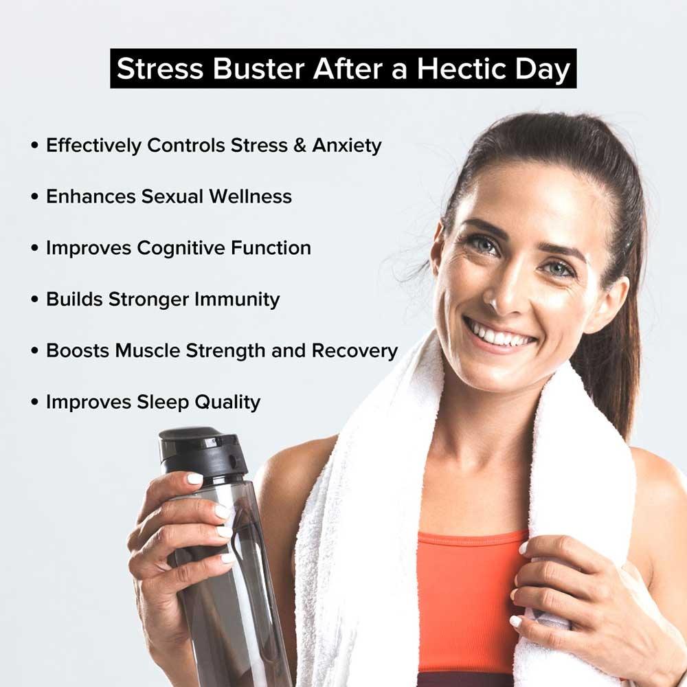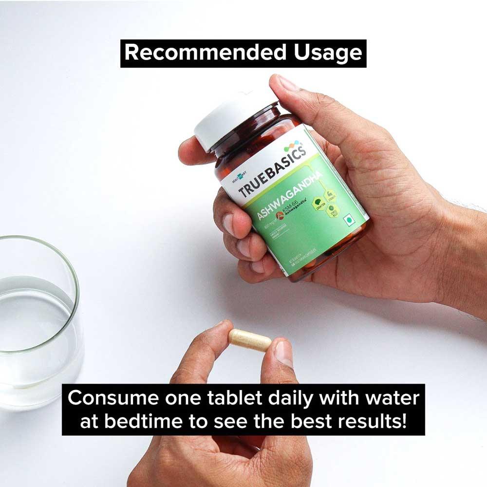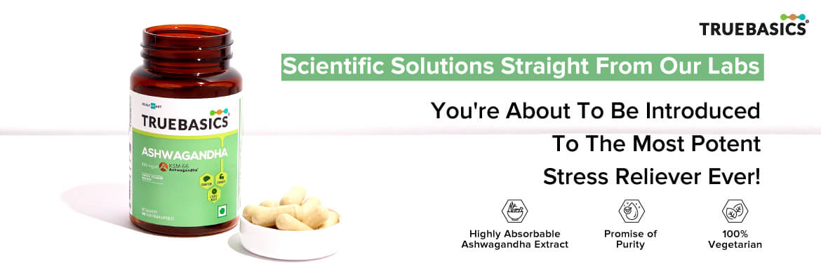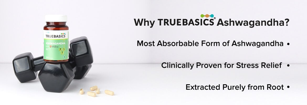 • Anxiety and Stress: TrueBasics Ashwagandha (from the house of HealthKart) may control stress by reducing the level of Stress hormone. It can help produce calmness, increased focus, and mental well-being.
