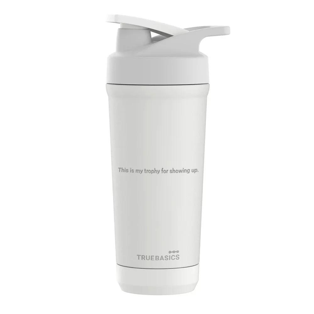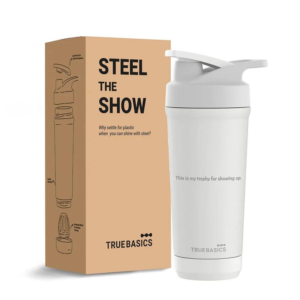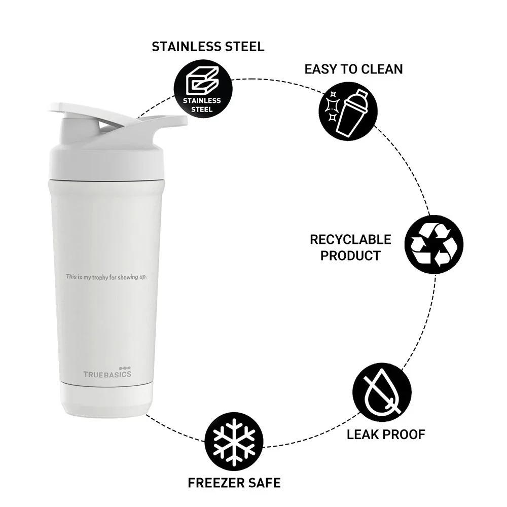 • Sleek Strong Spill-Free. – Crafted from premium stainless steel in a clean True White finish, the TrueBasics Steel Shaker is built for your everyday movement-whether you’re at the gym, at your desk, or on the go.