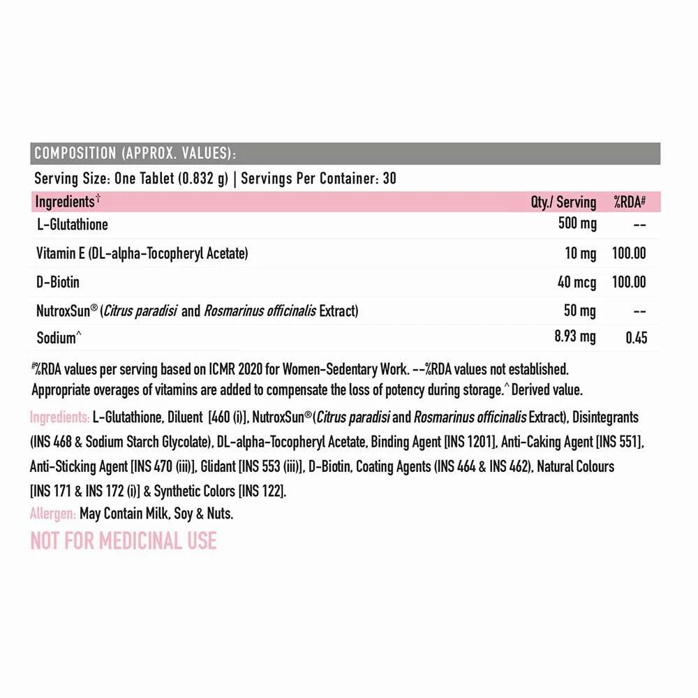 A scientifically formulated nutritional supplement containing L-Glutathione, clinically researched NutroxSun®, Biotin and Vitamin E for a radiant and youthful skin.