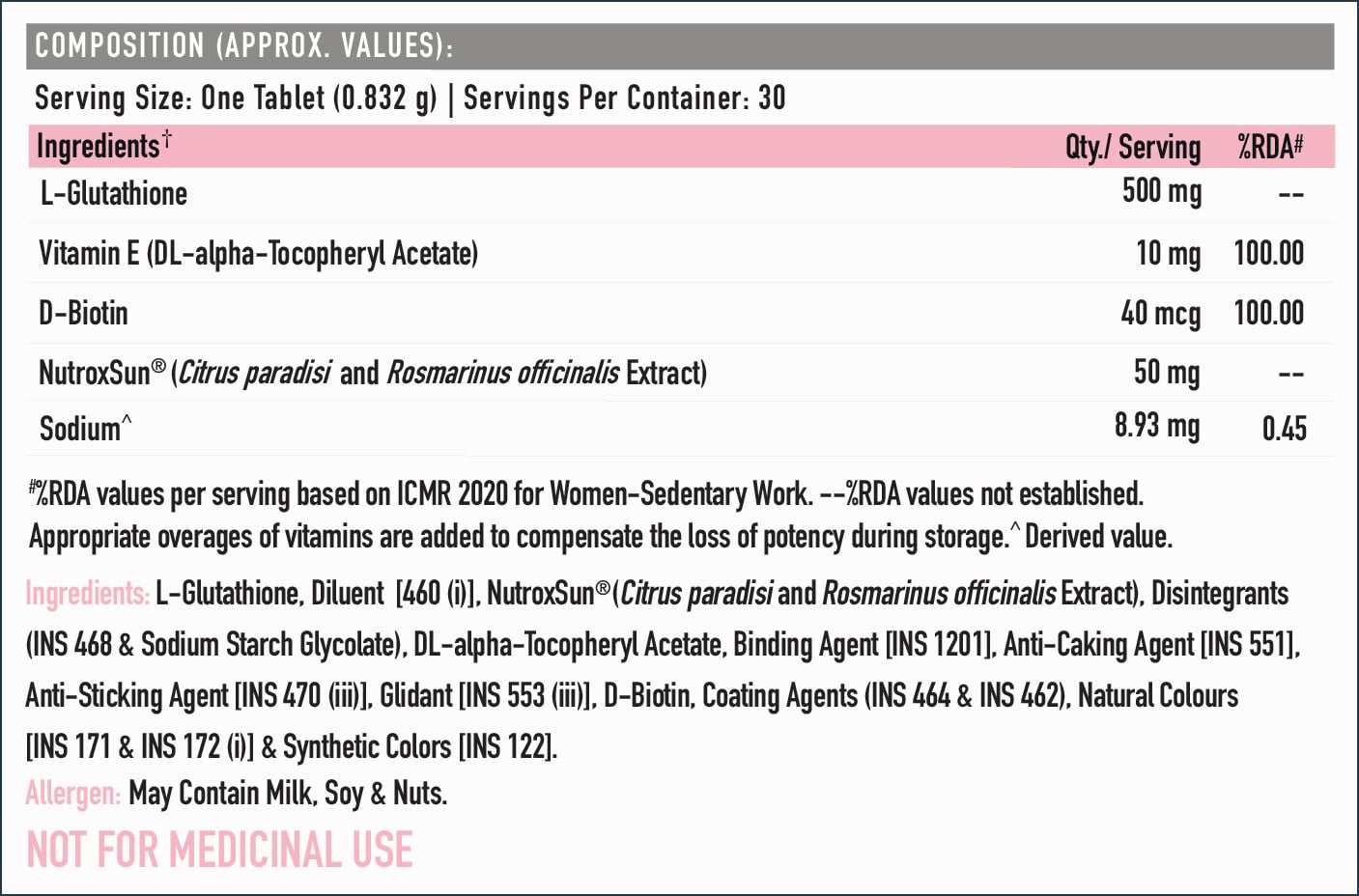 Other Information of TrueBasics Glutathione + Nutroxsun, 30 tablet(s)